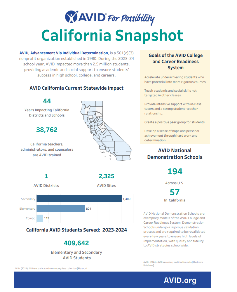 Advancement Via Individual Determination (AVID) is a global nonprofit organization dedicated to closing the opportunity gap by preparing all students for college and career readiness and success in a global society.