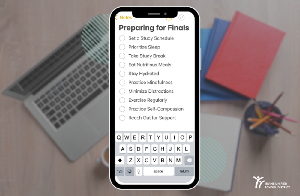 IUSD’s Mental Health and Wellness and Counseling teams recommend practicing mindfulness to help alleviate stress. Mindfulness can look different for each person and can include breathing and relaxation exercises, reading, listening to music, exercising and other activities that quiet the mind and support self-reflection, which can help students approach finals with a clear mind.