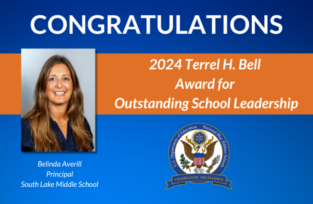 Averill will be honored at the National Blue Ribbon Schools Awards Ceremony in Washington, D.C., on Thursday, Nov. 7, 2024, where her dedication to fostering a culture of excellence at South Lake Middle School will be celebrated.