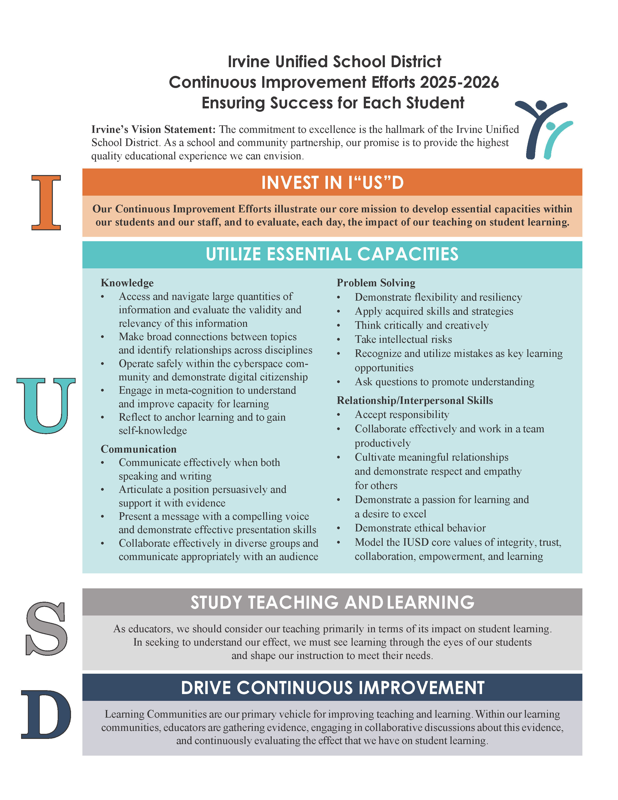 IUSD’s Continuous Improvement Efforts illustrate our core mission to develop essential capacities within our students and our staff, and to evaluate, each day, the impact of our teaching on student learning.